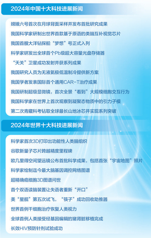 图为嫦娥六号首次在月球背面采样示意图。 中国科学院地质与地球物理研究所、中国科学院广州地球化学研究所供图 1月22日,由中国科学院、中国工程院主办的“两院院士评选2024年中国/世界十大科技进展新闻”在江苏南京揭晓。入选的科技进展直接触碰科技最前沿,涵盖视觉芯片、细胞疗法、大洋钻探、低温制冷、人工智能等诸多领域,表明人类探索未知世界的极限正不断拓展。 ——编者 2024年影响人类的科技进展有哪些?科技将会带来什么改变? 两院院士评选的2024年中国十大科技进展新闻分别是:嫦娥六号首次在月球背面采样并发布首批研究成果;我国科学家研制出世界首款基于原语的类脑互补视觉芯片;我国首艘大洋钻探船“梦想”号正式入列;科学家研发出全球首个Pb级超大容量光盘存储器;“天关”卫星成功发射并获系列成果;我国研究人员为无液氦极低温制冷提供新方案;我国学者发表国际首个通用CAR-T治疗成果;我国研制超级显微镜,首次全景“看到”大规模细胞交互行为;我国科学家在世界上首次观察到凝聚态物质中的引力子模;第二次青藏科考钻取全球最长山地冰芯并实现系列突破。 2024年世界十大科技进展新闻分别是:科学家首次3D打印出功能性人类脑组织;谷歌新量子芯片跨越精度里程碑;欧几里得空间望远镜公布首批科学成果,包括首张“宇宙地图”照片;科学家绘制迄今最大脑基因调控网络图谱;超精确癌细胞3D图谱问世;首个双语读脑装置让失语者重新“开口”;美“星舰”第五次试飞,“筷子”成功回收助推器;世界首例干细胞治疗恢复人类视力;全球首例人类接受经基因编辑的猪肾脏移植完成;长效HIV预防针剂试验成功。 在中国科学院院士、中国科学院广州地球化学研究所研究员徐义刚看来,这次入选的“十大”新闻呈现两大特点:一类是紧紧围绕最前沿的科学研究,例如嫦娥六号首次在月球背面采样并发布首批研究成果、我国科学家在世界上首次观察到凝聚态物质中的引力子模等;另一类是造福人类的科学研究,例如基于原语的类脑互补视觉芯片、通用CAR-T治疗成果等,它们的共同特点是都是公众关注的话题。 “两院院士评选2024年中国/世界十大科技进展新闻”至今已举办31次。评选结果经新闻媒体广泛报道后,使公众进一步了解国内外科技发展动态,对普及科学前沿知识起到了积极作用。 “每届‘双十大’评选结果的发布,都会引发全社会的广泛关注和积极响应。今年评选出的国内国际十大科技新闻,直接触碰科技最前沿:聚焦国内,视觉芯片、细胞疗法等创新有望加速产业重要变革,大洋钻探、低温制冷等技术的突破为重大工程提供了新方案;放眼国际,猪肾脏移植、长效HIV预防针剂等生命科学领域的突破,以及与人工智能等技术的结合,让许多‘不可能’变成‘可能’。”中国科学院副院长、党组副书记吴朝晖认为,“双十大”评选活动让更多人有机会深入了解国内外前沿科技成果,不仅能拉近公众与科技创新的距离、提升全民科学素质,更有助于在全社会推动形成讲科学、爱科学、学科学、用科学的良好氛围,营造大胆创新、勇于创新的社会环境,让更多青少年心怀科学梦想、树立创新志向。 中国工程院副院长、党组成员王辰表示,当前,新一轮科技革命和产业变革深入发展,科技的渗透性、扩散性、颠覆性特征更加凸显,科学向产业的直接转化进程加快,数字技术、智能技术的广泛应用正在深刻改变产业发展的图景。我们必须增强“不进则退、慢进亦退”的紧迫感,坚持“四个面向”的战略导向,持续以科技创新引领新质生产力发展,加强科技创新全链条部署、全领域布局,全面增强科技实力和创新能力,加快建设科技强国。 中国科学院院士徐义刚: “有组织的科研”贯穿整个研究进展 “‘嫦娥六号首次在月球背面采样并发布首批研究成果’入选,人类历史上的多项首次,不仅引起了国际同行的高度关注,也激发起公众的强烈兴趣。”中国科学院院士、中国科学院广州地球化学研究所研究员徐义刚说,人类探索未知世界的极限正不断拓展。 “有组织的科研”贯穿整个研究进展。 徐义刚介绍,对这项国家重大工程,国家航天局邀请中国科学院地质与地球物理研究所、中国科学院广州地球化学研究所等单位,采取“背靠背”的方式,根据各自专长和技术特点,在北京和广东广州等地对嫦娥六号月壤样品开展独立研究。在广州地化所拿到3克土壤样品后,团队分成4个小组,每组之间平行研究、组内接力工作,先筛选样品,然后再进行定量研究,不到24小时就完成了对样品的筛选,短短10天时间就获得了第一批月背样品的第一批研究数据。 依靠“有组织的科研”和“背靠背”的方法,团队高效且高质量地完成了任务。例如在确定月样年龄时,两个研究所开展独立研究,却得出一致结论,分别在《自然》和《科学》上发表,说明了数据的可靠性、研究的高质量。 “月球和行星科学在这次‘十大’中被看到、被关注,对年轻人来说,在他们心中种下了一颗探索奥秘、科技报国的种子,对科研团队的激励作用是巨大的。”徐义刚说,嫦娥六号月样的科研工作,还有很多科学问题尚待回答,团队将信心百倍地迎难而上,完成更艰巨的任务。 南京大学教授杜灵杰谈研究成果入选“十大” “对科研人员来说,这是最好的时代” “我国科学家在世界上首